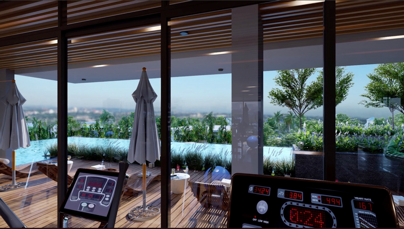 A state of the art gym overlooking the pool